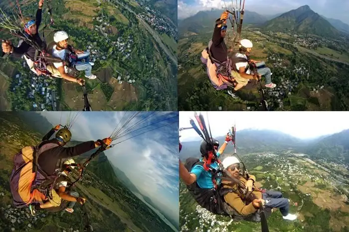 Paragliding is the recreational and competitive adventure sport of flying paragliders: lightweight, free-flying, foot-launched glider aircraft with no rigid primary structure.[1] The pilot sits in a harness or lies supine in a cocoon-like 'pod' suspended below a fabric wing. Wing shape is maintained by the suspension lines, the pressure of air entering vents in the front of the wing, and the aerodynamic forces of the air flowing over the outside.For all those adrenaline junkies, there is also an option to go for paragliding. The majestic beautiful valley beneath is a sight to behold. The unique view of the green valleys makes paragliding one of the most thrilling things to do in Kashmir. Paragliding options are available in Sonamarg, Gulmarg, Bhaderwah, Sanasar, and Harwan (Srinagar). Of these, paragliding in Harwan is most easily accessible as it lies on the route of the tour of the Grand Mughal Gardens.